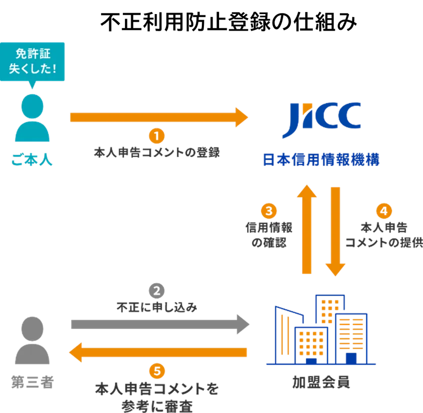 ※ JICCが不正利用防止効果を保証するものではありません。本人確認書類の紛失・盗難時には、最寄りの警察署に遺失届出書の提出を行ってください。また、本人確認書類の発行元への連絡を忘れずに行ってください。