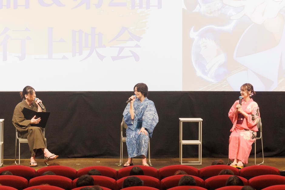 第1話と第2話の上映が終わり興奮冷めやらぬ中、司会進行を務める木村さんがステージに登場すると、そのままキャスト陣のトークショーへ突入。この日は登壇キャスト全員が、作品の世界観とリンクした浴衣で登場し、華やかな姿に客席からは思わず歓声が上がった。