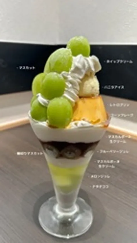地元・岡山県産の旬の大粒シャインマスカットをたっぷりと使用した、宝石のように美しいパフェは、驚きの11層仕立てとなっており、倉敷プリンのパティシエの腕が光る、贅沢な一杯となっております。