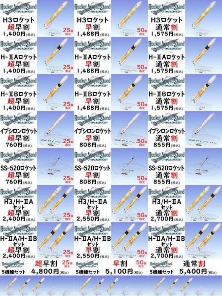 返礼品:H3ロケットアクスタ、H-ⅡAロケットアクスタ、H-ⅡBロケットアクスタ、イプシロンロケットアクスタ、SS-520ロケットアクスタ