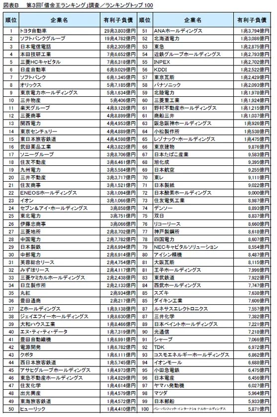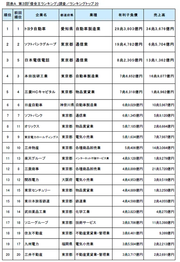 第3回借金王ランキング1位は「トヨタ自動車」、2位「ソフトバンクグループ」、3位「日本電信電話」の順となりました。