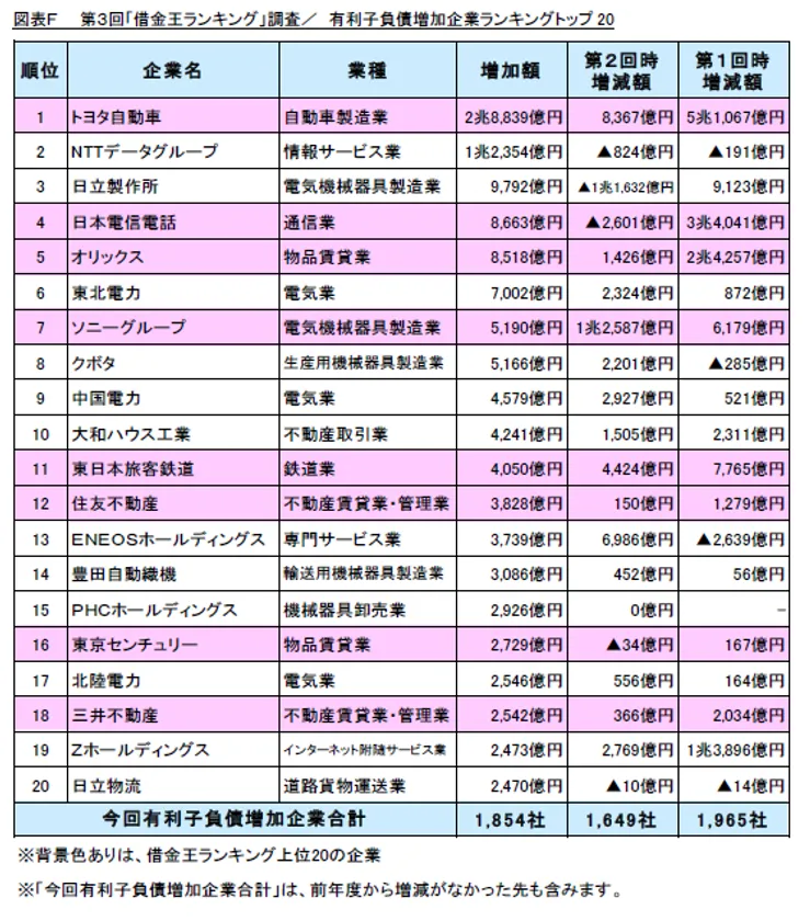 借金王ランキングトップ20の企業から、有利子負債増加企業トップ20に「トヨタ自動車」、「日本電信電話」、「オリックス」など8社がランクインし、減少企業トップ20には「ソフトバンクグループ」、「三菱商事」、「本田技研工業」など6社がランクインしています。