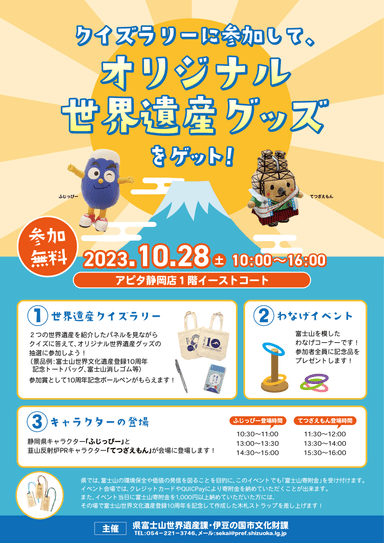 静岡県にある2つの世界遺産を紹介したパネルを見ながらクイズに答えると、オリジナル世界遺産グッズの抽選に参加できます。(景品例:富士山世界文化遺産登録10周年記念トートバッグ、富士山消しゴム等)また、参加賞として参加者全員に10周年記念ボールペンを差し上げます。