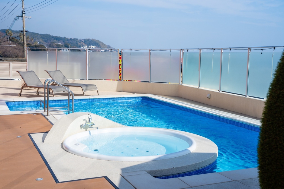 日没後はライトアップされ、隣のジェットバスも発光。まだ多くの施設がプールを開放していない4月、仲間やパートナーとだけで、一足早い夏のひとときをお過ごしいただけます。