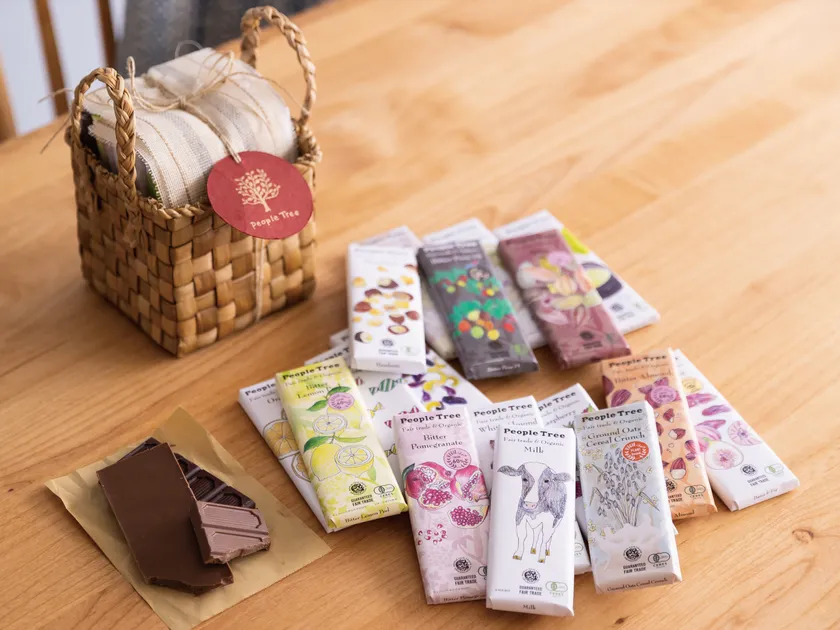 ピープルツリーには自然素材を使ったオーナメントをはじめ、ツリーに飾れる手編みのニット小物、手漉き紙のカードなど、クリスマスグッズが豊富に揃っています。職人さんたちの想いがこもった手づくりのアイテムは、プレゼントを贈る人と受け取る人の心もあたたかくしてくれます。大好評のフェアトレード&オーガニックチョコも、プレゼントにぴったりです。