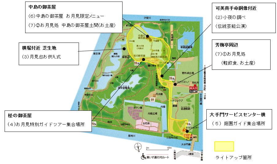 【内容】お月見に合わせて夜間、園内をライトアップし光と影で演出します。江戸湾に面した「浜御殿(はまごてん) 」の雰囲気をお愉しみ ください。