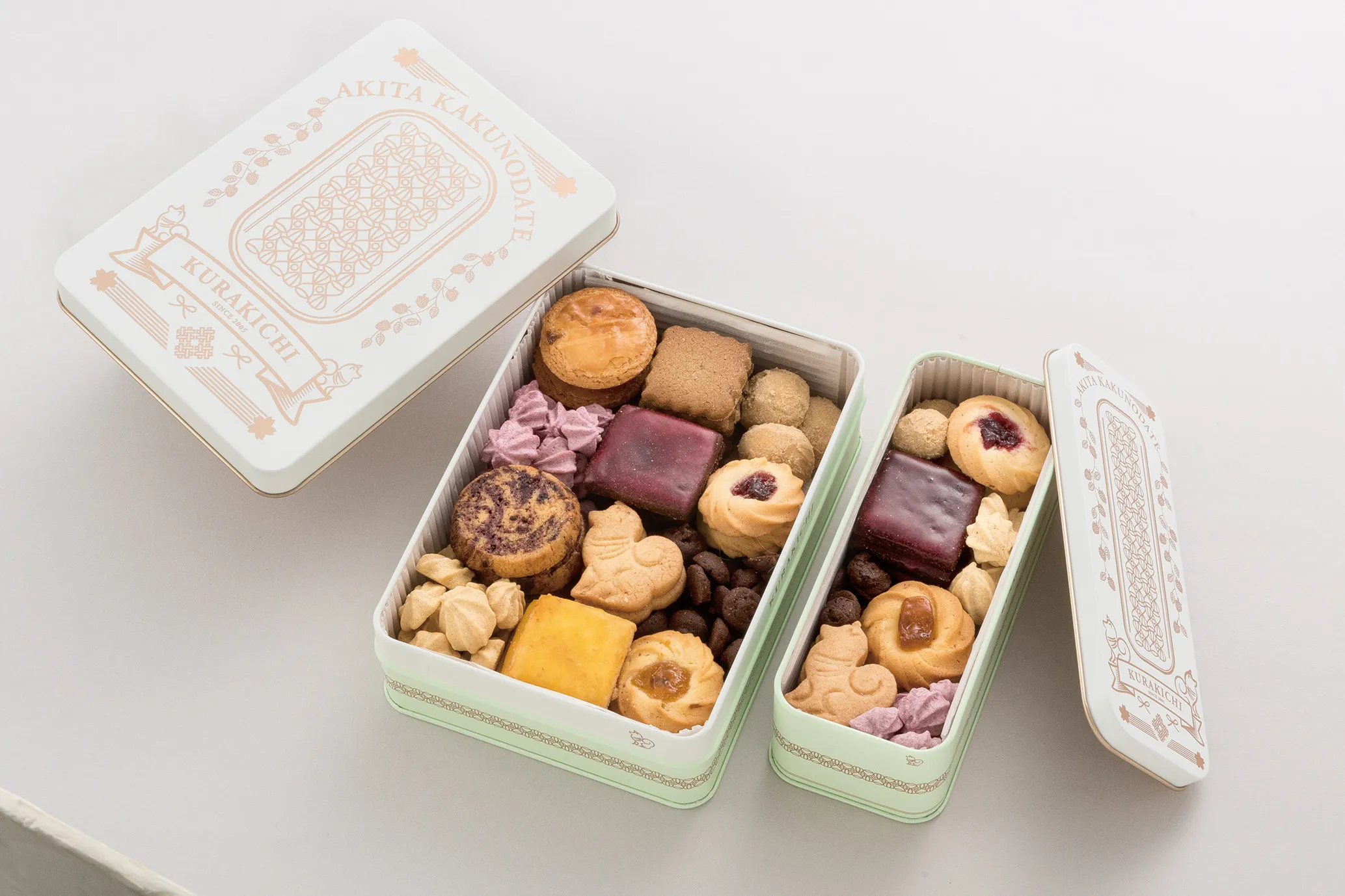 秋田犬モチーフのクッキーや、秋田県産のキイチゴやほおずきを使ったクッキーを詰めたクッキー缶。缶には、さりげなく2匹の秋田犬を描きました。