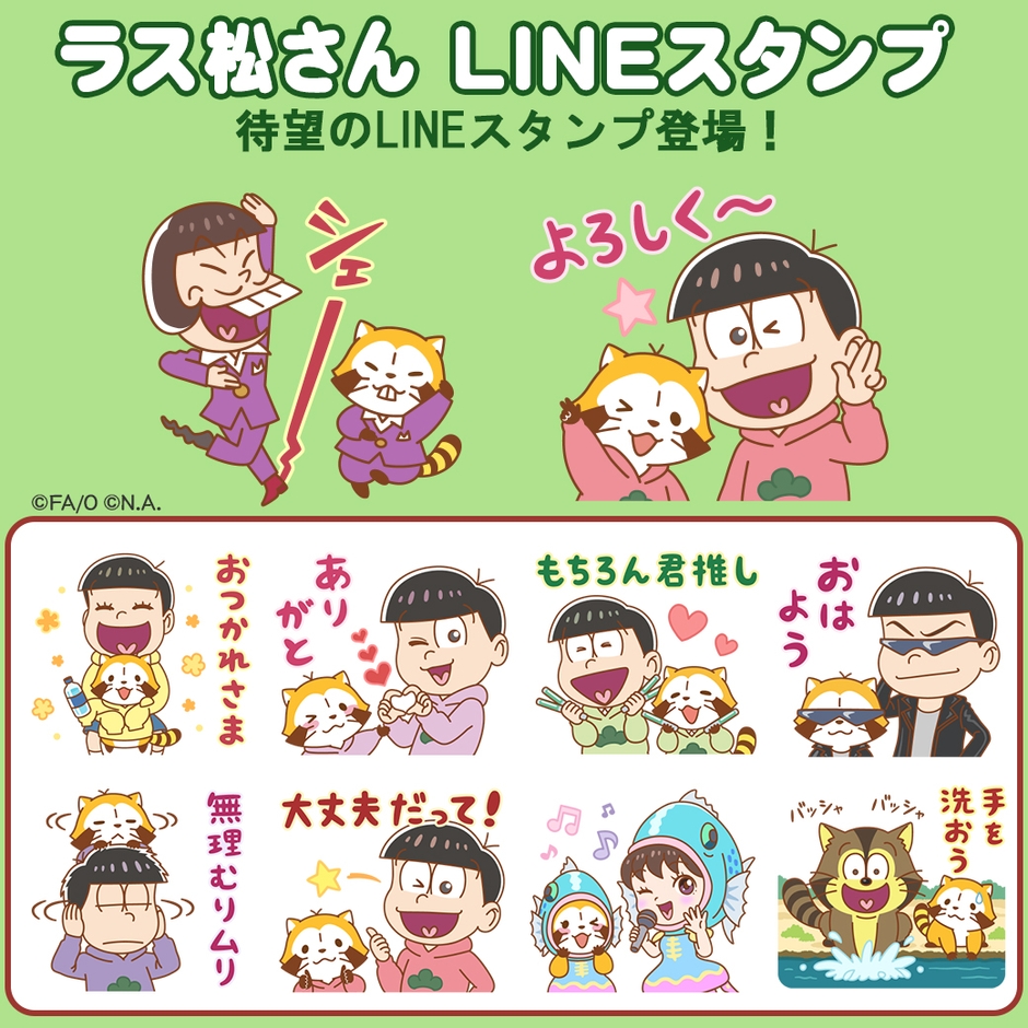 2021年3月にECくじ「楽天コレクション」にて『ラス松さん』としてコラボレーションを実施した「おそ松さん」と「ラスカル」。今回のLINEスタンプでは、6つ子はもちろん、昨年のECくじでは登場しなかった、「イヤミ」・「トト子」・「チビ太」・「デカパン」・「オムスビ」などの人気キャラクターに加えて、「おそ松さん」のテレビアニメで描かれた“あらいぐま”も登場します。