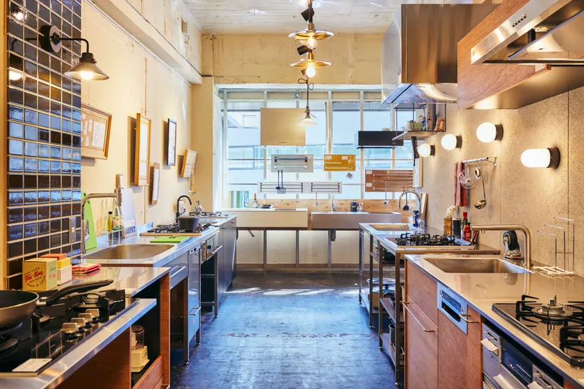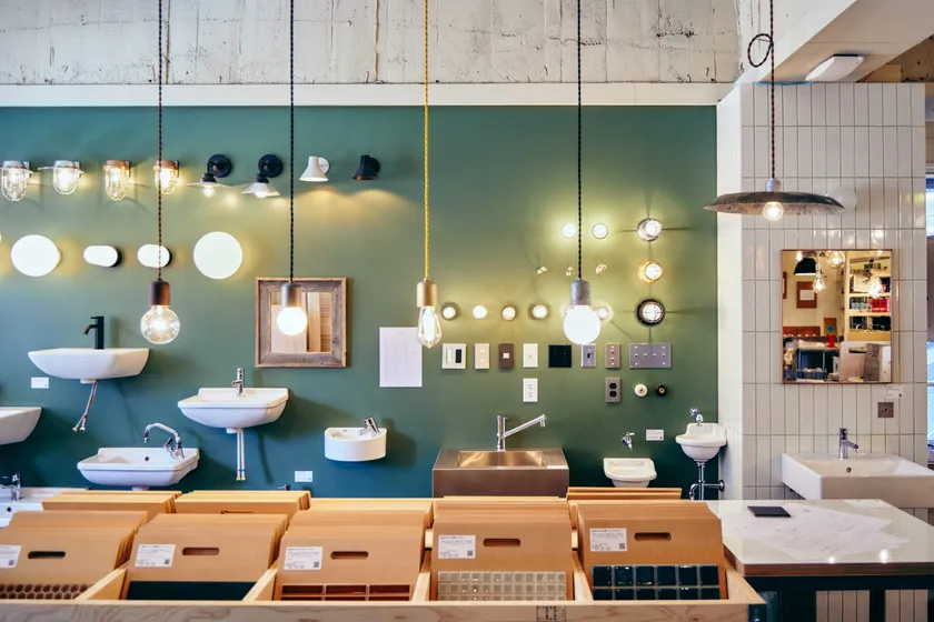 広さ約112m2の空間の中に展示商品はおよそ1,200点。キッチン・洗面・フローリング・建具・照明にパーツなど、内装・インテリアに関わるアイテムを横断的に取り揃えています。