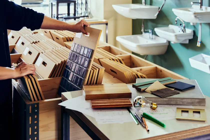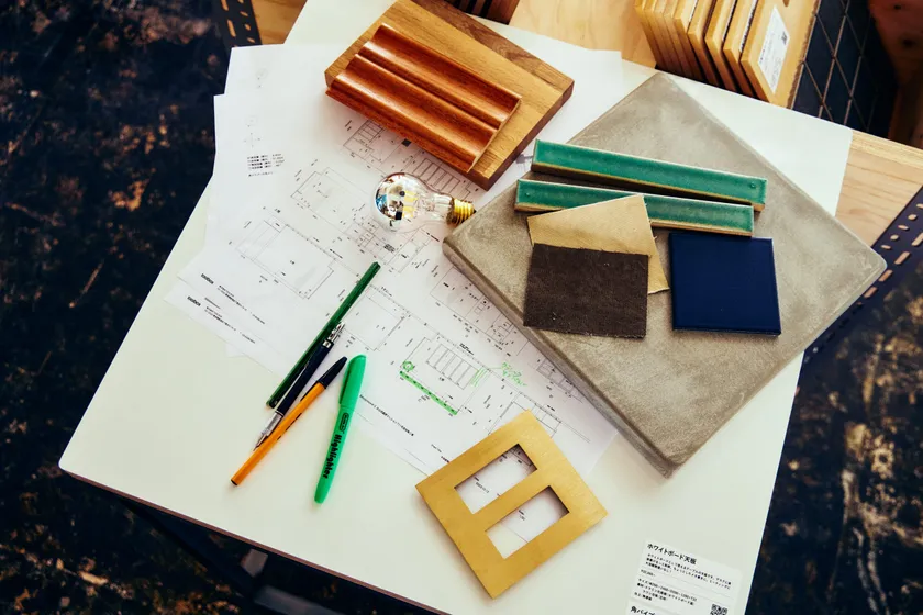 気になった素材と素材を、商品サンプルなどを用いて、洋服を組み合わせるように自由にコーディネートできるデスク。 完成させたコーディネートはそのままお持ち帰りいただけるので、一緒に家づくりをする方とイメージの共有にもご活用ください。