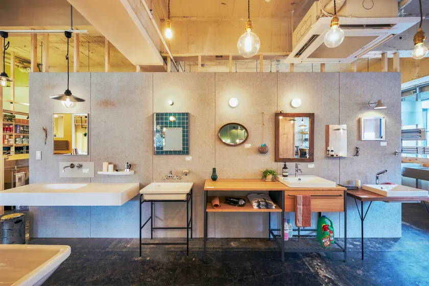 洗面のコーディネートを並べたコーナー。直近の購入予定がない段階でも空間づくりの参考にしていただけます。