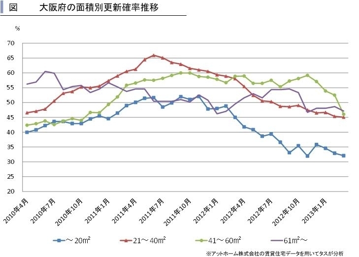 また関西圏・中京圏版では「市場競争力の低い20m2未満の賃貸住宅(大阪府)」および「2013年5月期の関西圏・中京圏賃貸住宅指標(空室率TVI(タス空室インデックス)、募集期間、更新確率)」を掲載しています。