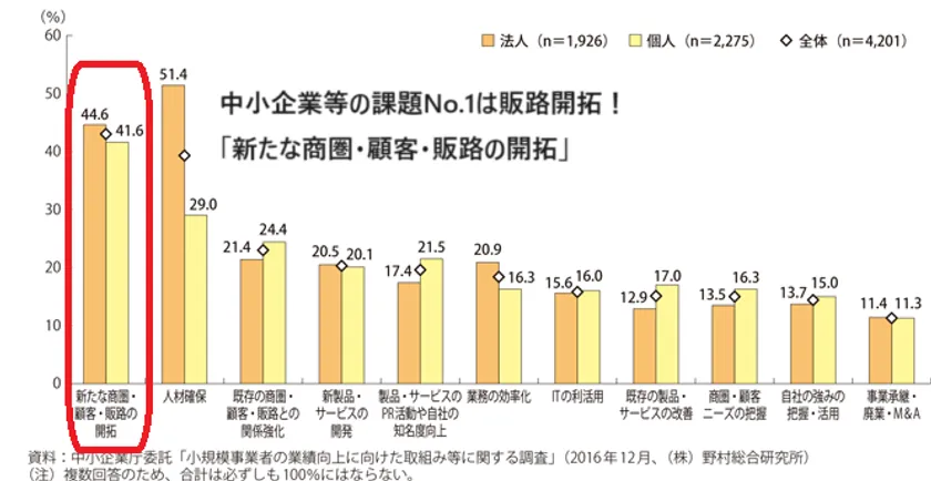 多くの事業者様は「新たな商圏・顧客・販路の開拓」に課題感を持っている統計データがあります。特にコロナ禍以降、オンラインを活用した販路開拓が進む中、競合との差別化はより一層困難となっている状況が推測されます。