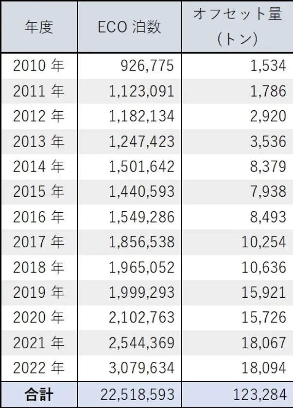 スーパーホテルは「自社が排出するCO2に責任を持つ」という基本方針に基づき、2010年に全店舗でカーボン・オフセット付宿泊サービス「ECO泊」を導入しました。2023年3月末時点、「ECO泊」宿泊数は延べ22,518,593泊となり、これによるカーボン・オフセット累計削減量は123,284トンに達しました。「ECO泊」は宿泊1泊あたりのCO2排出量を算定して、利用室分のCO2排出量をオフセットする取り組みです。公式ホームページからの予約時に「カーボン・オフセット付宿泊」であることを顧客に伝える顧客参加型のCO2削減の取り組みにより宿泊者への啓発効果も生み出しています。カーボン・オフセット実施先との連携により地域の森林整備や保全に貢献しています。