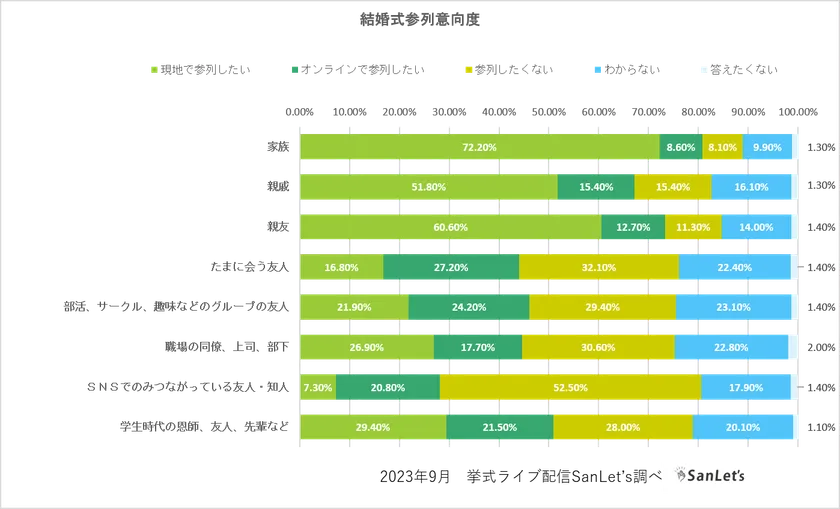 新郎新婦との関係性別に、結婚式への参列意向を「現地」「オンライン」「参列したくない」のいずれかを聞きました。家族では現地で参列したい意向が72%、親友でも現地で参列したいが60.6%と高くなりました。一方、たまに会う友人や部活、サークル等グループの友人では、「オンラインで参列したい」がそれぞれ27.2%、24.2%と「現地で参列したい」を上回りました。