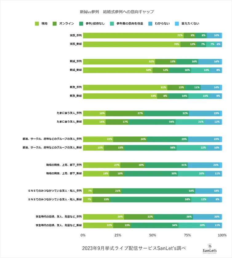 同時期におこなった新婦目線のアンケートでも立場を変えて同様の質問をおこなっており、参列者目線と新婦目線で回答について比較を行いました。全体的に近しい関係性の場合は新婦側の「現地に招待したい」より参列者の方が「現地で参列したい」意向が高く、カジュアルな関係性の場合は新婦側の「オンラインで招待したい」より参列者側の「オンラインで参列したい」意向が高い結果となりました。
