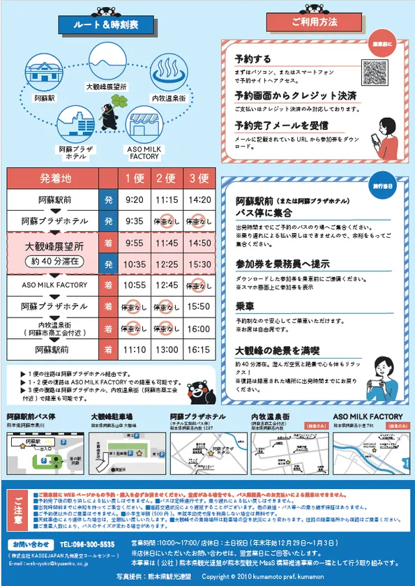 1便目(阿蘇駅前9:20発)は阿蘇市内に宿泊したチェックアウト後の観光客、2便目(阿蘇駅前11:15発)はJR特急「あそぼーい」を利用して阿蘇駅に到着する観光客、そして3便目(阿蘇駅前14:20発)は阿蘇市内で宿泊する観光客をターゲットに想定。大観峰観光の前後に、阿蘇山火口や草千里、阿蘇神社などの阿蘇観光とつなげることが可能です。また、南阿蘇鉄道株式会社、九州旅客鉄道株式会社、九州産交バス株式会社、産交バス株式会社の4社にて先行スタートした、阿蘇や南阿蘇地域を一日中、公共交通で周遊できる便利でお得なチケット「あそ旅のレールバス・みなみあそ旅のレールバス( https://sankobus.artpro.co.jp/ )」と組み合わせることで、阿蘇周遊観光の幅がぐっと広がります。