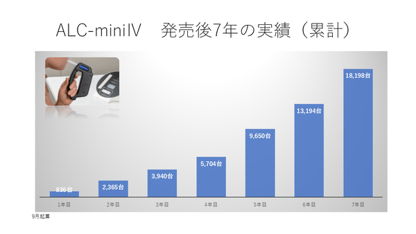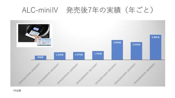 2017年9月に発売された本機器は発売から7年が経過しました。2022年末から2023年にかけて半導体不足により一時期出荷が滞りましたが、2023年12月1日の安全運転管理者選任事業所におけるアルコール検知器使用義務化(いわゆる白ナンバー飲酒検査義務化)施行を経て、発売から7年目は過去最高5000台/年を超え、総出荷は約1万8千台となりました。