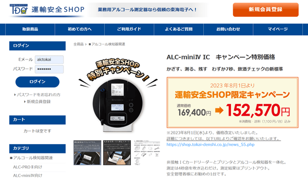 コロナ禍の折、対面による営業活動が制限されたことを受け、ALC-miniⅣ ICは2021年11月から東海電子公式ECサイト”運輸安全 SHOP“から購入できるようになっています。