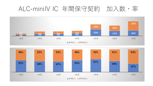 7年目は保守加入率がやや落ちました。7年目は一般企業(白ナンバー等)による手軽なECサイト購入が増え、緑ナンバー事業者と比べるとライトな運用(壊れたら買い換える、修理代をそのとき払う)にしようと割り切る顧客層が増えたことが要因と思われます。