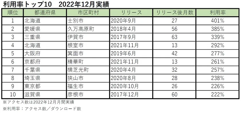 また、アプリダウンロード数に対する月間アクセス数を利用率と定め、利用状況の評価を行いました。年末の大掃除や不規則な収集カレンダーによりアクセス数の増える12月を評価対象とし2022年の利用状況を見ると、最も利用率の高い北海道士別市のアプリではリリース後2年以上経過しているにもかかわらずダウンロード数に対し400%のアクセスがありました。また主要な機能を持ちデータ取得可能な132件のアプリの平均でも利用率が121%となっており、利用者によるアプリの活用も活発な状態が維持されていることが分かりました。