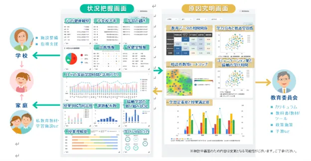 今後は「状況把握画面」に児童・生徒のメンタルヘルスの悪化やSOSを早期に把握するための「心の健康観察」、保健室情報などの生活に関する情報や単元テストの躓きや家庭学習状況、協働学習実施状況、授業満足度などの学習に関する情報を追加し可視化することを予定しています。加えて、新たに「原因究明画面」の提供を予定しています。「原因究明画面」は「状況把握画面」に蓄積されたデータをもとに、学校・学級の状態を分析する画面です。教育データを組み合わせ様々なグラフで可視化し、データに基づいた個別最適な学びから教育施策の改善にまで生かせるような情報を提供します。