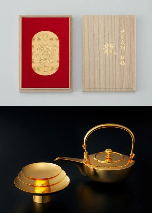金相場高騰が続いている中、「金」はお子様やお孫様に継承するものとしても注目されています。SGCゴールドショップから、2024年の干支「辰(龍)」の招福大判と新年にお酒を美味しく愉しむお銚子と盃を純金でご用意しました。親から子へ受け継がれる福袋です。
