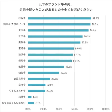 一番割合の低いもので4.5%となりましたが、ここに挙げたものもブランド牛のごく一部です。ブランド牛ごとに知名度にはかなりの差があることがわかります。