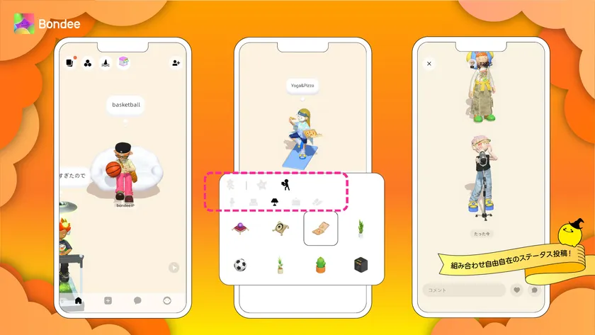 『Bondee ボンディー』は、自分のアバターを作成し、50人の友だちと密なコミュニケーションができる次世代メタバースSNSです。