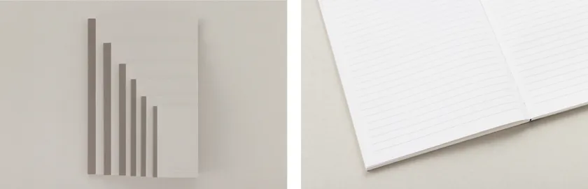 ベーシックな横罫は日付欄付きで日記帳としてもお使いいただけます。3mm方眼罫はイラストや図解など、想い描いたものをそのままかき出すことにおすすめです。縦罫は太字の万年筆でも書きやすいゆとりのある罫幅になっており、自分の文字や言葉に意識を向けることができます。