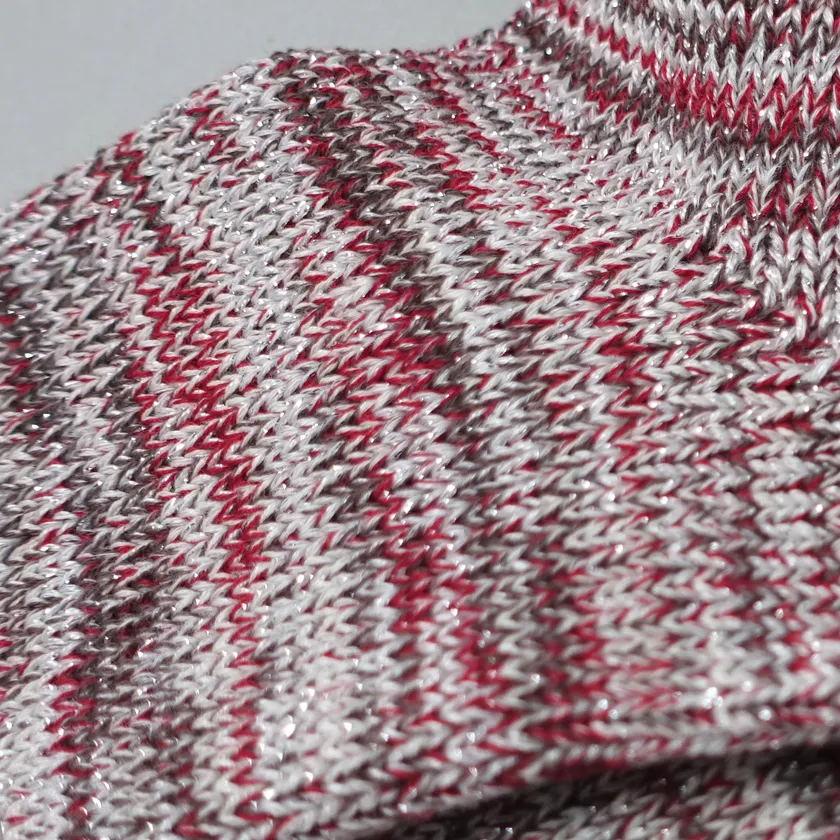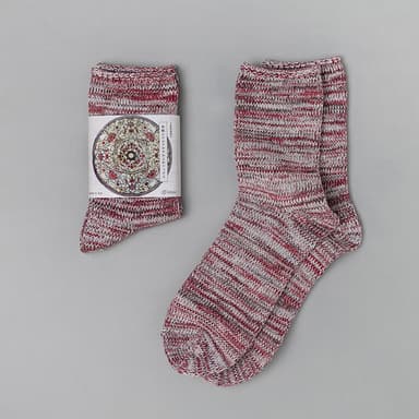自転車を漕ぐ力で靴下を編む「チャリックス」( https://www.charicks-online.jp/ )にも使われている、希少なヴィンテージの靴下編機を使用し、「平螺鈿背八角鏡」から着想を得た数色の糸を束ねて編みあげています。同じ色の糸を使いながらも、一足一足同じ柄に編みあがらないことから「思うようにいかない様」を表現しています。一つずつ違う色合いの妙を、ぜひお楽しみください。