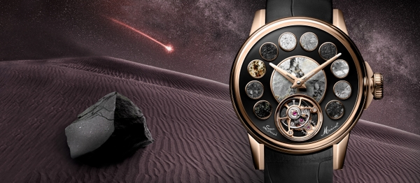 サテン仕上げを施した文字盤中央に最も希少な月の隕石、フライングトゥールビヨンのキャリッジ裏側にブラックのL5コンドライト隕石を配しています。また、その他10種類の隕石を、文字盤の円周に沿うように配置。それぞれの隕石が異なるストーリーや特徴を持っており、長い宇宙空間の旅の果てに宇宙からの宝物として時計に収められ、約45億年前から現在までの宇宙の歴史を物語ります。