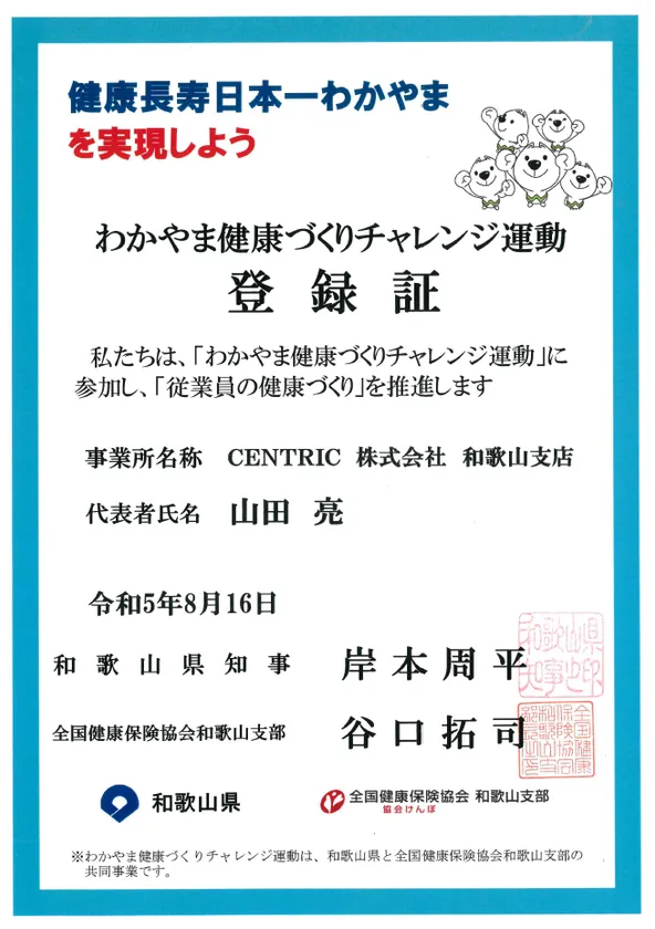 「わかやま健康づくりチャレンジ運動」へ参加、登録証を取得 CENTRIC和歌山支店が従業員の健康づくりを推進