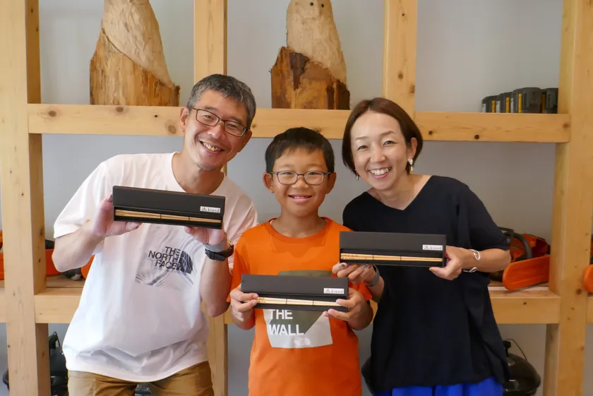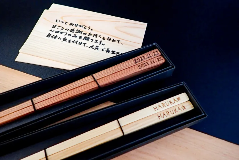 体験では、箸に名入れや日付などの焼き入れができ、世界に一つだけのペアのお箸をお作りいただけます。木のメッセージカードもご用意していますので、結婚祝い等の贈り物にもぴったりです。