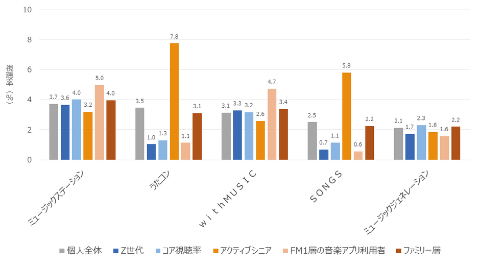 レギュラー音楽番組を分析した結果、番組ごとに視聴者属性に違いがあることがわかりました。
