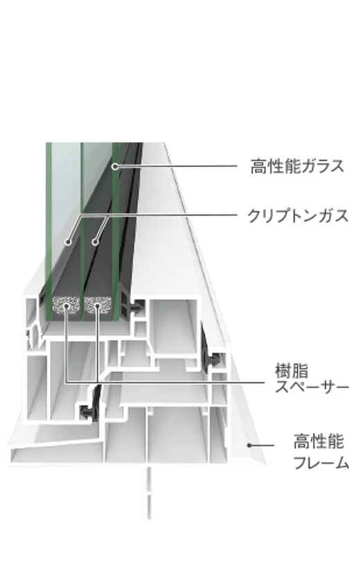 樹脂サッシ内に断熱材を配置し、トリプルガラスの中空層には熱伝導率が低いクリプトンガラスを封入することで、断熱性・気密性を実現。