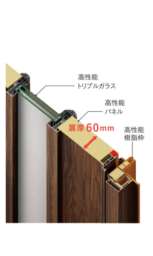 上枠と縦枠に熱を伝えにくい樹脂を採用し、中空内に断熱材を入れた高断熱玄関扉
