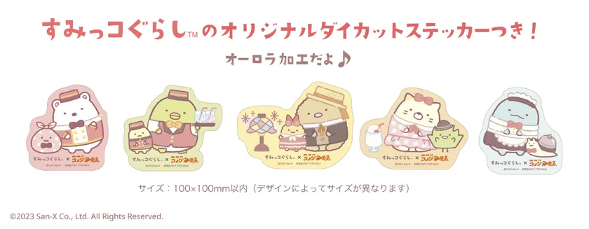 「シロノワール いちごのミルフィーユ(ミニサイズ含む)」、「つぶつぶいちごミルク」を、1商品ご注文ごとに、すみっコぐらしオリジナルダイカットステッカーをランダムで1枚プレゼントいたします。ステッカーはオーロラ加工されており、すみっコたちの絵柄は全5種類。