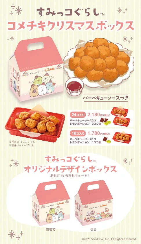 ジューシーで食べやすい一口サイズの骨なしチキン「コメチキ」。クリスマスにぴったりのコメチキボックスが、今年はすみっコぐらしコラボ限定デザインで登場です!かわいいボックスをお持ち帰りして、すみっコたちと一緒にクリスマスパーティーが楽しめます!中身は18コ入りと24コ入りの2種類。コメチキと相性抜群の、バーベキューソースをつけて召し上がれ。