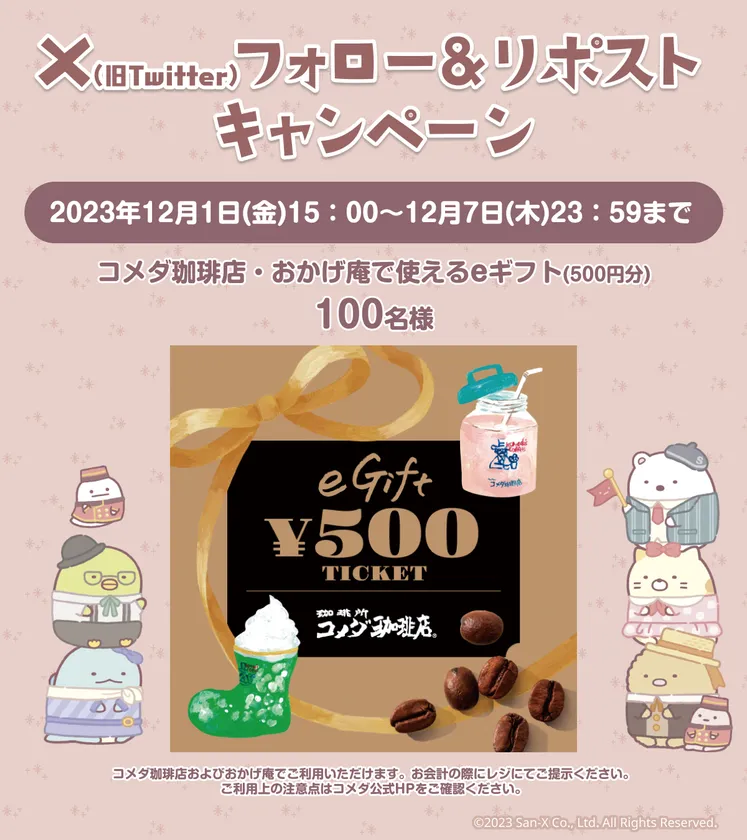 期間中にコメダ公式Xのアカウントをフォローし、対象の投稿をリポストすると、抽選で100名様にコメダ珈琲店・おかげ庵で使えるeギフト券(500円分)が当たります。
