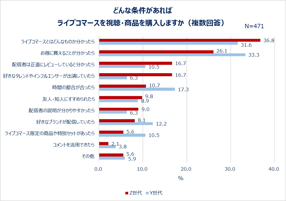 ライブコマースでの商品購入経験がない人に対しては、ライブコマースを視聴・商品を購入したくなる条件を聞きました。Z世代は「ライブコマースとはどんなものか分かったら(36.8%)」と回答した人が最も多く、理解度が上がれば活用する人も増えそうです。Z世代はY世代と比べて「配信者は正直にレビューしていると分かったら(16.7%)」「好きなタレントやインフルエンサーが出演していたら(16.7%)」と回答した人が多いことから、誰が出演しているか・レビューに信ぴょう性はあるかを重視する人が一定数いることが分かります。Y世代は「お得に買えることが分かったら(33.3%)」と回答した人が最も多く、価格的なメリットが行動変化のきっかけになると考えられます。