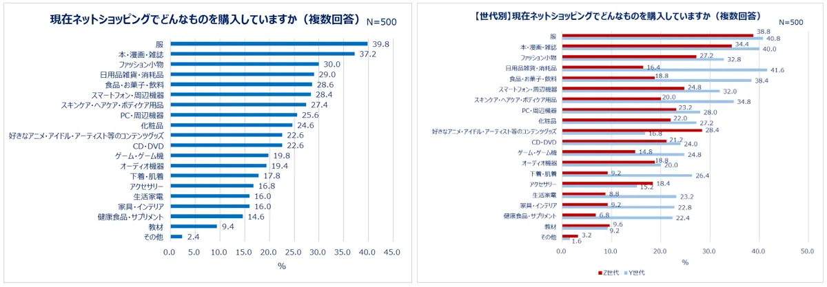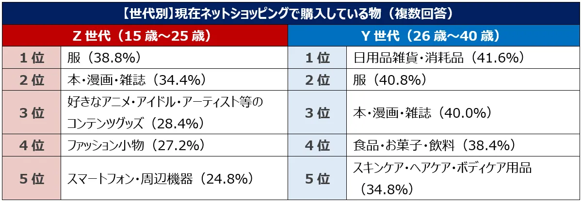2.現在ネットショッピングで買う物 Z世代の1位は「服」、Y世代の1位は「日用品・消耗品」