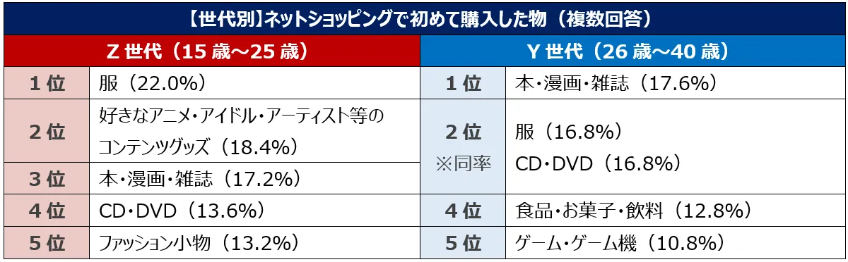 初めて購入した物は全体で「服」が1位!Z世代で「推しグッズ」、Y世代で「本・漫画・雑誌」も上位に