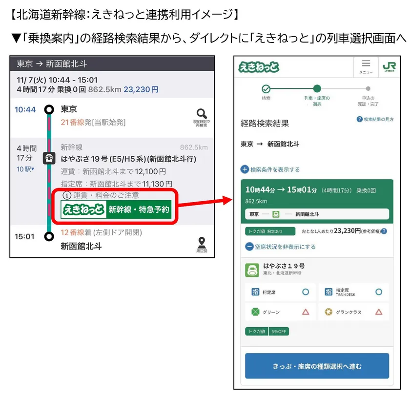 「乗換案内」が北海道新幹線の予約連携を開始 検索結果から新青森~新函館北斗間を含むきっぷが購入可能に