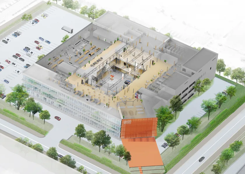 既存の2棟を、増改築によってドーナツ状に接続した構造で、中央のアトリウム部を取り囲む明るく開放的な「Roland Circuit」は、社員のコミュニケーションと創造性を活性させる空間となります。中央部の「Roland Arena」は、社員やコミュニティのさまざまなアイデアを自由に実現できるパフォーマンス・スペースとなります。