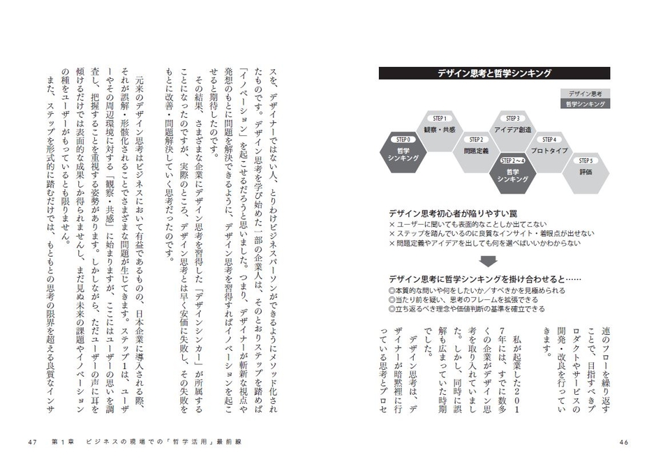 第1〜3章は、哲学者の思考の基礎を練習すれば誰でも実践できるよう、著者が考案したメソッド「哲学シンキング」を中心に、その用途、方法、企業での導入例を紹介しています。