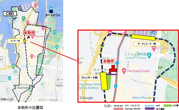 本物件は、1980年に竣工した、地上33階・地下4階建ての複合施設(オフィス・商業)で、オーストラリアの最大都市であるシドニー市のCBD(※2)のメインストリート(George Street)に面しています。周辺には、大手企業のオフィスやハイブランドの商業施設(旗艦店)、歴史的建造物等が立地しています。また、都市鉄道であるシドニートレインズのウィンヤード駅に地下で直結しているほか、近くにLRT(路面電車)の駅や多くのバス停等があり、交通利便性にも優れています。