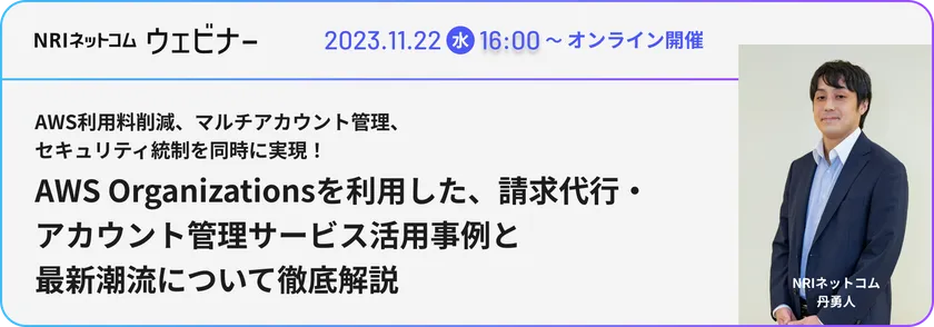 NRIネットコム株式会社(東京本社:東京都港区、代表取締役社長:大野 庄一)は、「AWS利用料削減、マルチアカウント管理、セキュリティ統制を同時に実現!AWS Organizationsを利用した、請求代行・アカウント管理サービス活用事例と最新潮流について徹底解説」をテーマにしたAWS関連の書籍を多数執筆する専門家によるオンラインウェビナーを、2023年11月22日(水)16:00~17:00に開催します。