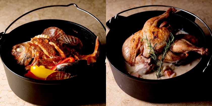「魚介とキノコたっぷりのブイヤベース エスプーマチーズを添えて」は、最後の一滴までおいしい魚介とキノコを贅沢に使ったブイヤベース。「丸ごと鶏のシチュー」は、香ばしくグリルした鶏が丸ごと入った豪快なクリームベースの鍋となっています。
