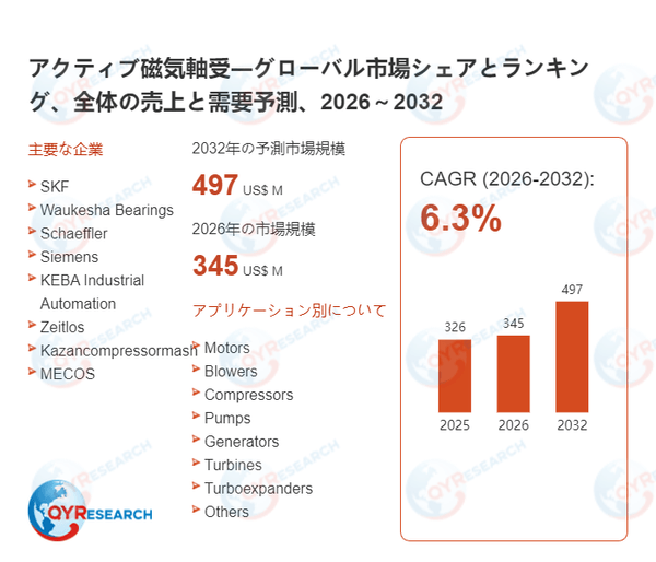QYResearchが発表した新たな市場調査レポート「アクティブ磁気軸受―グローバル市場シェアとランキング、全体の売上と需要予測、2026~2032」によると、世界のアクティブ磁気軸受市場規模は2025年の約326百万米ドルから2026年の345百万米ドルへと順調に拡大すると見込まれ、予測期間中は年平均成長率(CAGR)6.3%で成長し、2032年には497百万米ドルに達すると予測されている。